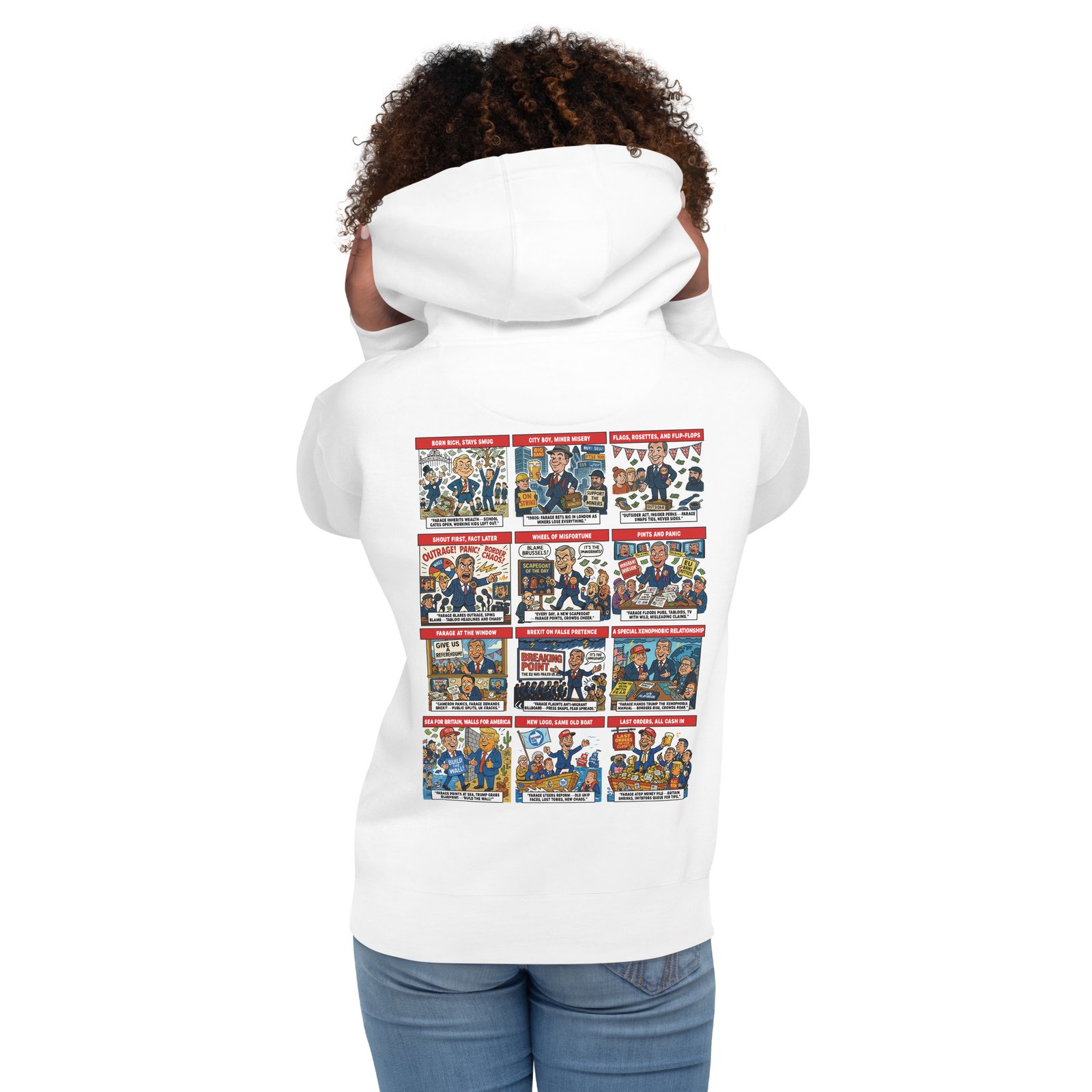 • The full-width, high-res Farage cartoon strip covering the entire back—bold, brash, and impossible to ignore
